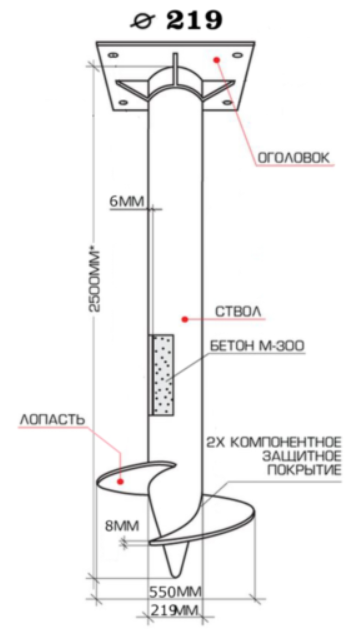 Винтовые сваи диаметром 219 мм, как правило, изготавливаются из высокопрочной стали, часто с дополнительным антикоррозионным покрытием. Это обеспечивает высокую прочность и долговечность конструкции, защищая от коррозии в агрессивных средах.
